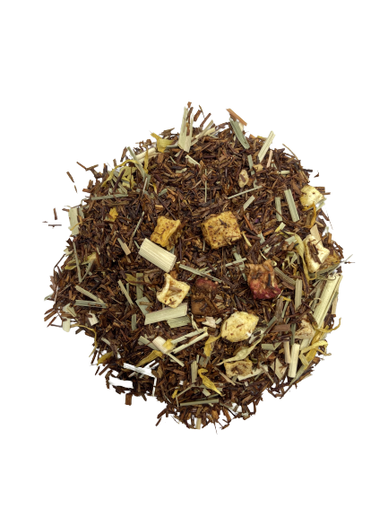 Composition : rooibos*, citronnelle*, arôme naturel, dés de mangue lyophilisés*, morceaux de fraise lyophilisés*, fleurs de souci*.