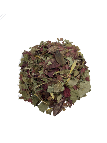 vigne rouge*, feuilles de myrtille*, feuilles de cassis*, menthe douce*, menthe poivrée*, fleurs de tournesol*. (*issu de l’agriculture biologique UE et non UE)